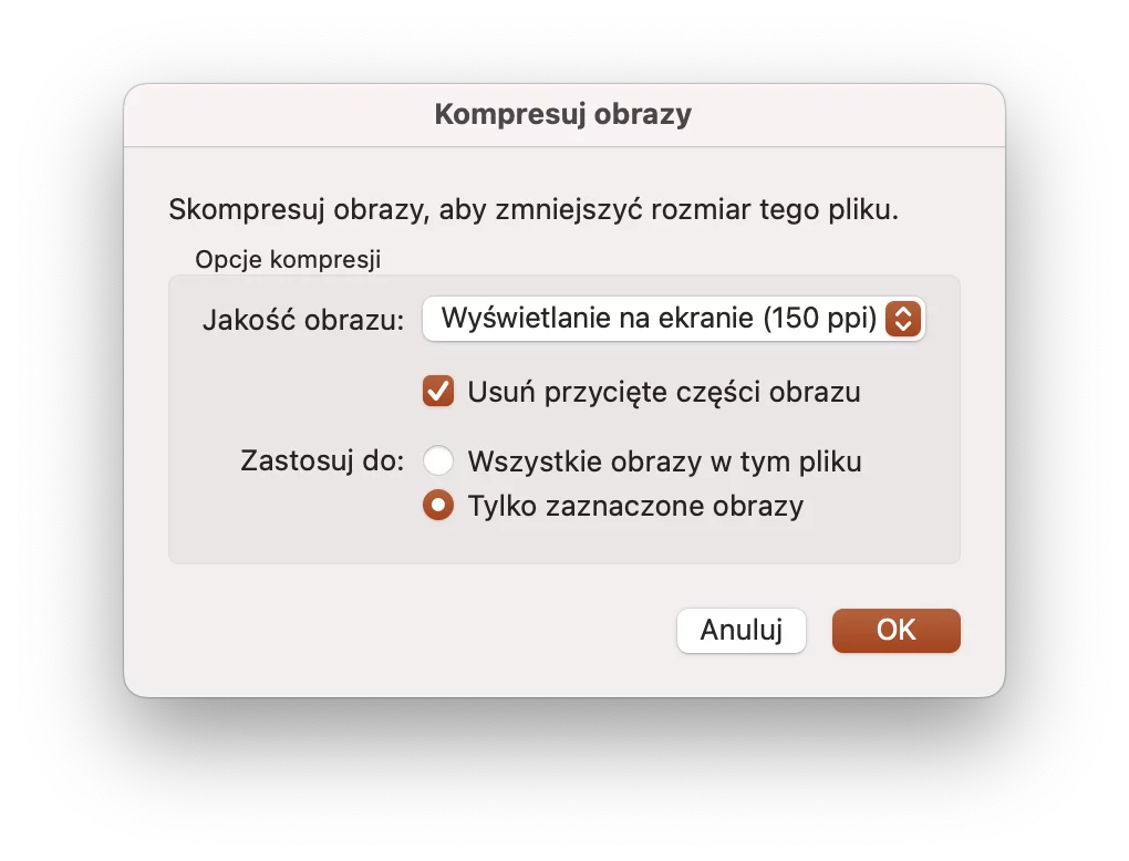 Plik > Kompresuj obrazy Ustawienie opcji „Wyświetlanie na ekranie 150 ppi” to najlepsza opcja, jeśli wysyłasz pliki mailem i prezentujesz je na spotkaniach na rzutniku.