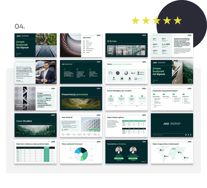 Tworzymy pozostałe slajdy zgodnie z ustalonym wzorem. Rozliczenie końcowe 50% po finalnej akceptacji. Gotowy projekt przekazujemy w formacie edytowalnym + PDF.