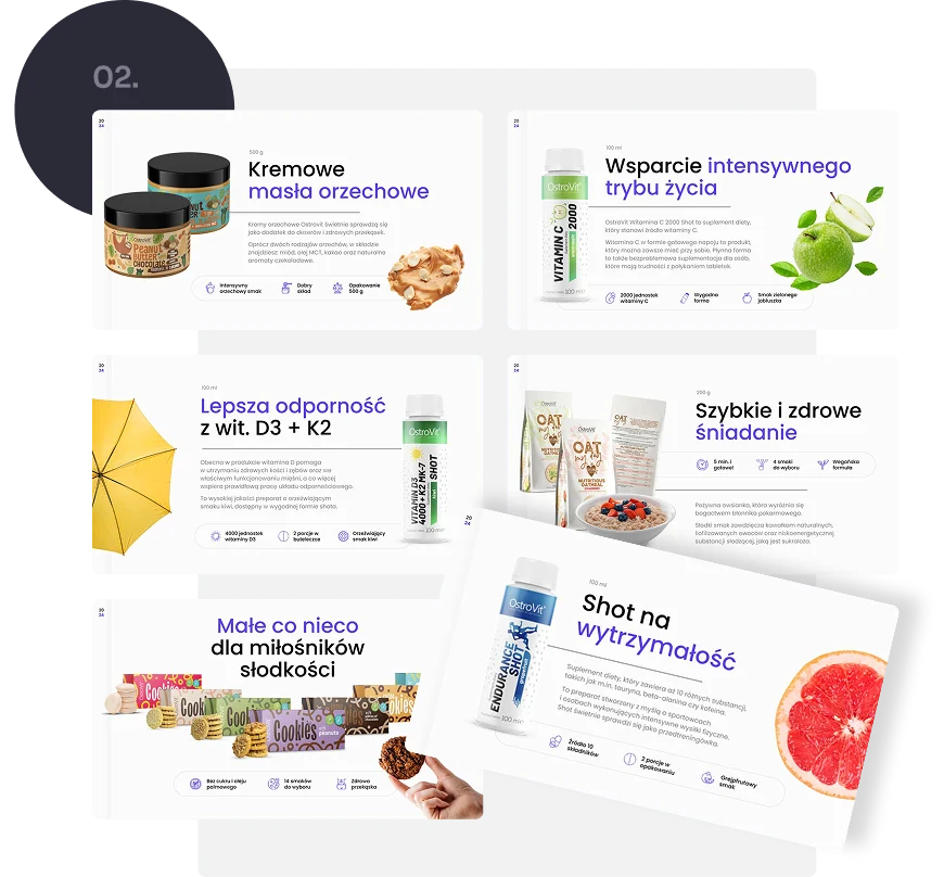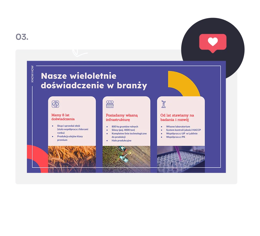 Projekt tworzony od zera w oparciu o identyfikację wizualną Twojej firmy. Spójność marki na każdym slajdzie.