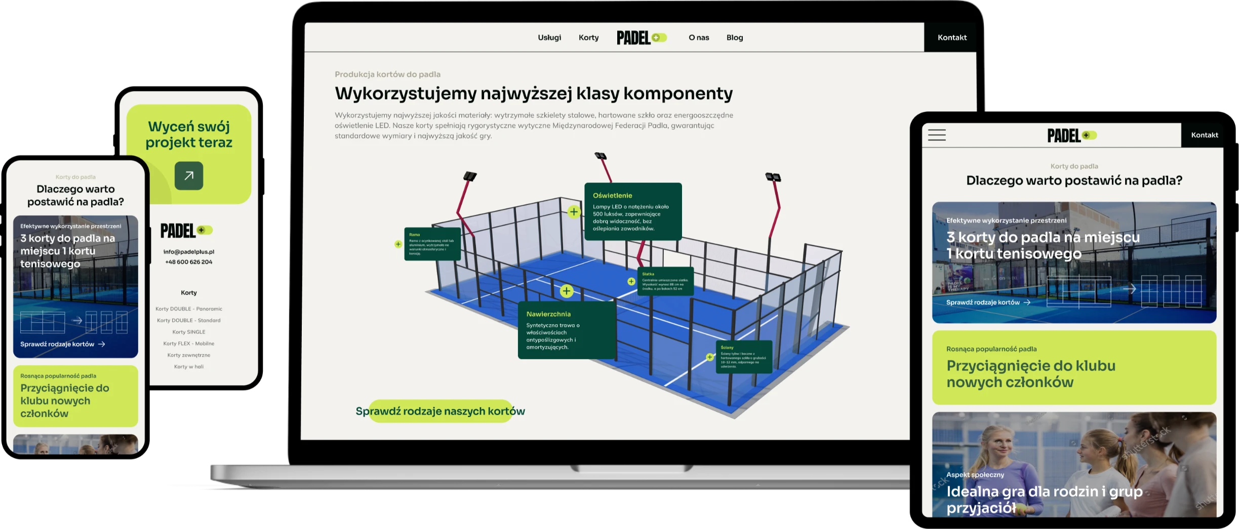 Zrealizowaliśmy kompleksowy projekt strony internetowej dla producenta kortów padlowych, który obejmował pełen zakres prac od koncepcji po finalną implementację. Proces rozpoczęliśmy od zebrania materiałów źródłowych od klienta oraz przeprowadzenia profesjonalnej analizy konkurencji rynkowej, co pozwoliło nam zidentyfikować kluczowe przewagi konkurencyjne.