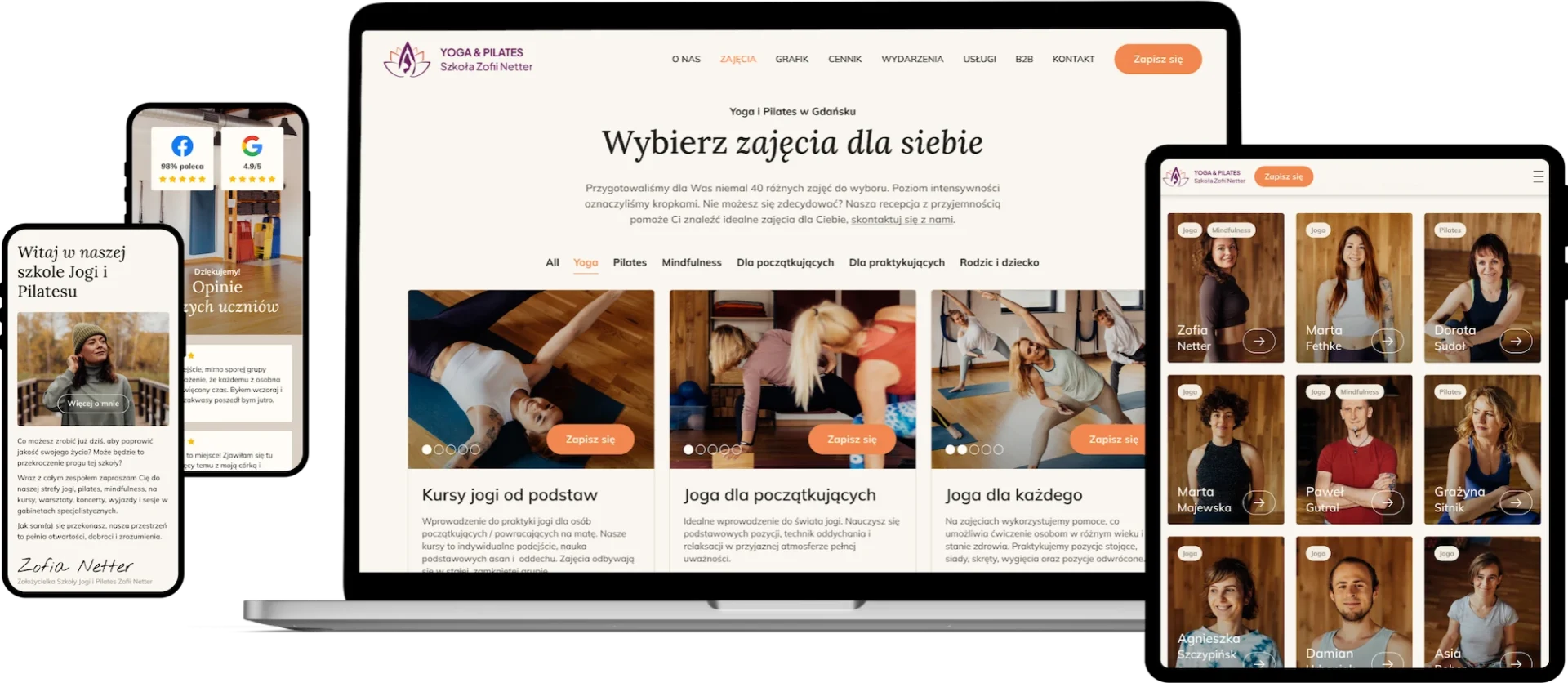 Dla szkoły Yoga & Pilates Zofii Netter w Gdańsku przygotowałam kompletny projekt graficzny strony internetowej, łączący estetykę wellness z przejrzystością i wygodą użytkowania. Layout został zaprojektowany tak, by w czytelny sposób prezentować ofertę zajęć, wydarzeń i voucherów, a przy tym wspierać intuicyjne poruszanie się po serwisie. Spójna paleta kolorów, przemyślany układ treści oraz dbałość o detale wizualne tworzą przyjazne, profesjonalne wrażenie.